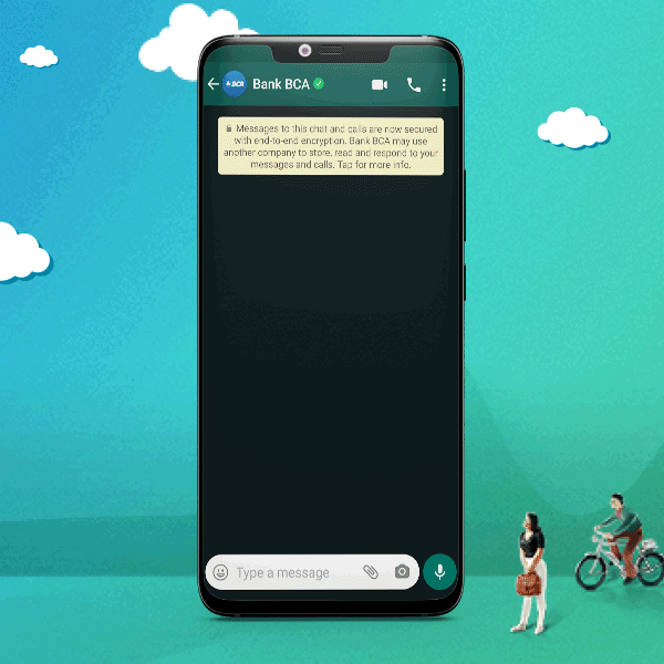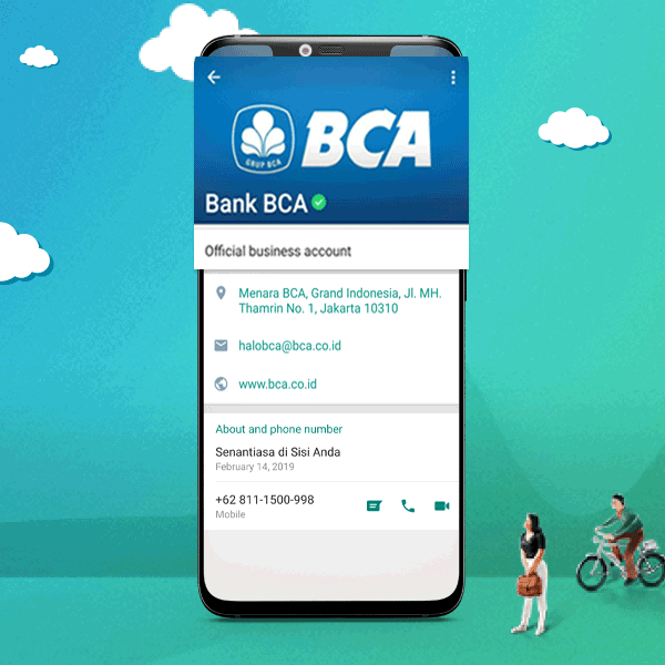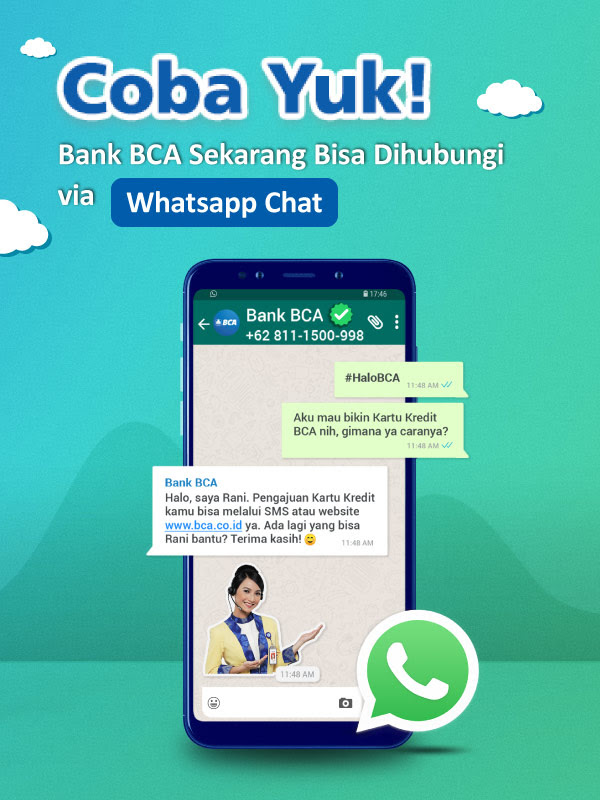 Nah, Bank BCA kini hadir di aplikasi WhatsApp! Kamu dapat melakukan chatting untuk menanyakan informasi dan promo BCA ke official business account WhatsApp Bank BCA selama 24 jam dan 7 hari seminggu.